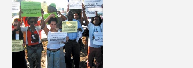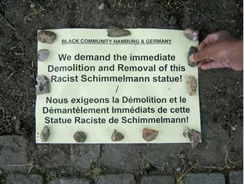 Die Black Community Hamburg demonstrierte erneut am 25.5.08 vor der Schimmelmannbüste in Wandsbek. Bilder > |