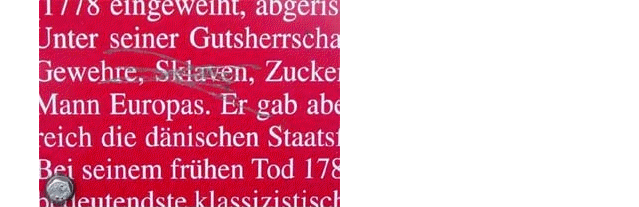 Von der afrikanischen 'Goldküste' in Guinea wurden Sklaven nach Übersee in die Karibik verschifft; im 18. Jahrhundert jährlich bis zu 80.000 Menschen nach Schätzung der UNESCO. Die Jungferninseln St. Thomas, St. Jan und St. Croix waren im Besitz der königlichen 'Dänisch-Westindisch-Guinesischen Kompanie' mit Christian VI als Hauptaktionär an der Spitze. Von den karibischen Plantagen kamen Zucker, Baumwolle, Tabak und andere Waren nach Kopenhagen, Flensburg, Altona und Hamburg; Waffen, Baumwolltuch u.a. gingen für den Tausch gegen Sklaven wieder nach Afrika. |