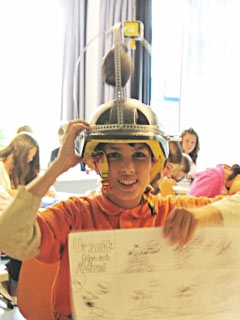 9. Klasse der Otto-Hahn-Schule in Wandsbek, Kunstunterricht für das Projekt wandsbektransformance / Straßen-Be-Schreibung. Der Schüler trägt ein Helm mit einer Glocke, entworfen von der bildenden Künstlerin Judith Haman. Ähnliche Kopfbedeckungen wurden Sklaven aufgesetzt, damit sie nicht wegliefen. |
