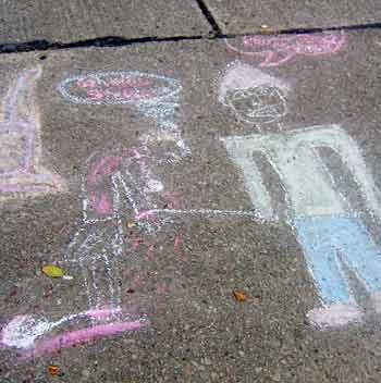 Kreidezeichnung auf dem Asphalt des Schimmelmannstiegs: Schülerinnen der Otto-Hahn-Schule präsentieren ein Bild mit Sklaven und Sklaventreiber. Welche Farbe hat die Angst?, fragte die Schulklasse.