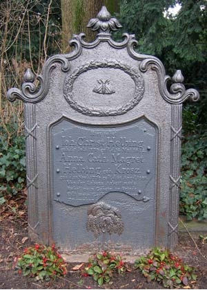 Das Grab des Spirituosenfabrikantenfamilie Helbing auf dem historischen Friedhof in Wandsbek. Oben auf dem Grabstein symbolisiert die Biene den Kaufmannsfleiß, unten die Palme das Kolonialgeschäft in Afrika.