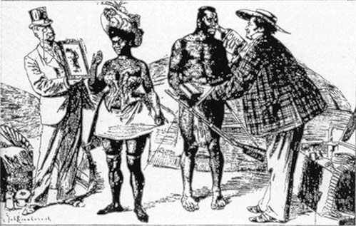 aus: Heiko Möhle: Branntwein, Bibeln und Bananen. Der deutsche Kolonialismus in Afrika - eine Spurensuche in Hamburg, Hamburg 1999, S. 44-45